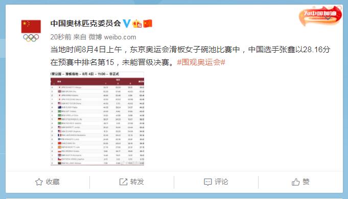 中工网讯 据中国奥林匹克委员会官微消息,当地时间8月4日上午,东京奥运会滑板女子碗池比赛中,中国选手张鑫以28.16分在预赛中排名第15,未能晋级决赛。