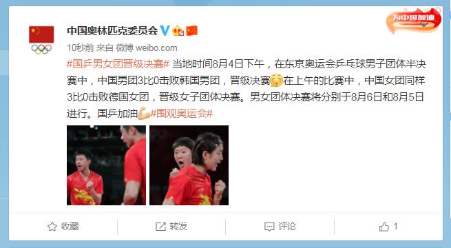 中工网讯 据中国奥林匹克委员会官微消息,当地时间8月4日下午,在东京奥运会乒乓球男子团体半决赛中,中国男团3比0击败韩国男团,晋级决赛。在上午的比赛中,中国女团同样3比0击败德国女团,晋级女子团体决赛。男女团体决赛将分别于8月6日和8月5日进行。