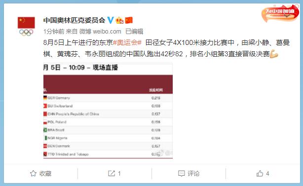 中工网讯 据中国奥林匹克委员会官微消息,8月5日上午进行的东京奥运会田径女子4X100米接力比赛中,由梁小静、葛曼棋、黄瑰芬、韦永丽组成的中国队跑出42秒82,排名小组第3直接晋级决赛。