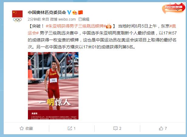 中工网讯 据中国奥林匹克委员会官微消息,当地时间8月5日上午,东京奥运会男子三级跳远决赛中,中国选手朱亚明两度刷新个人最好成绩,以17米57的成绩获得一枚宝贵的银牌,这也是中国运动员在奥运会该项目上取得的最好名次。另一名中国选手方耀庆以17米01的成绩获得列第8名。