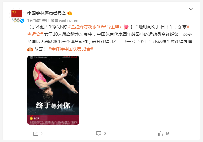 中工网讯 据中国奥林匹克委员会官微消息,当地时间8月5日下午,东京奥运会女子10米跳台跳水决赛中,中国体育代表团年龄最小的运动员全红婵第一次参加国际大赛就跳出三个满分动作,高分获得冠军。另一名“05后”小花陈芋汐获得银牌。