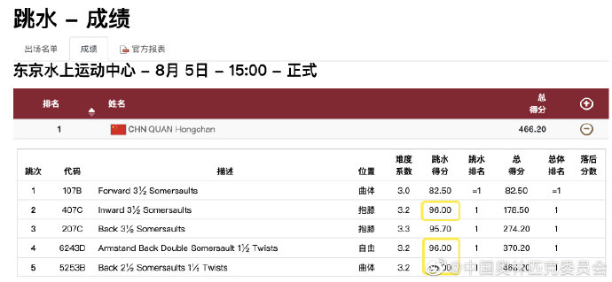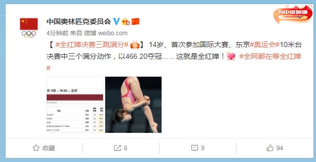 中工网讯 据中国奥林匹克委员会官微消息,中国跳水队14岁小将全红婵首次参加国际大赛,在东京奥运会10米台决赛中以三个满分动作,总分466.20分夺冠。