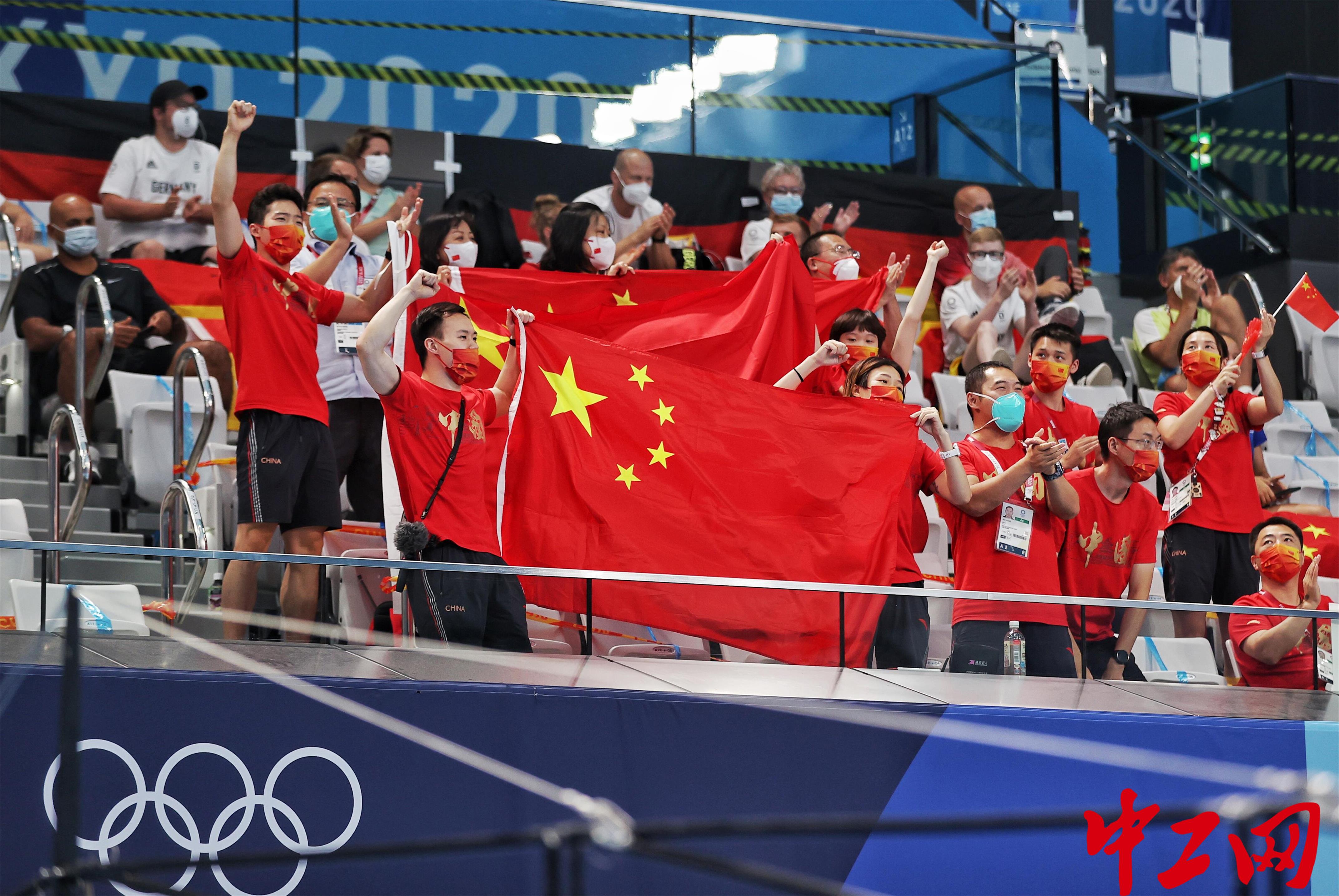 中国跳水梦之队的队友们在场边欢呼庆祝。