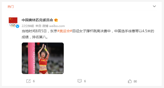 中工网讯 据中国奥林匹克委员会微博消息,当地时间8月5日,东京奥运会田径女子撑杆跳高决赛中,中国选手徐惠琴以4.5米的成绩,排名第八。