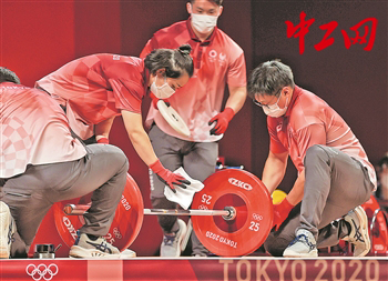 ③ 7月24日下午,在举重比赛中使用的国产品牌杠铃。