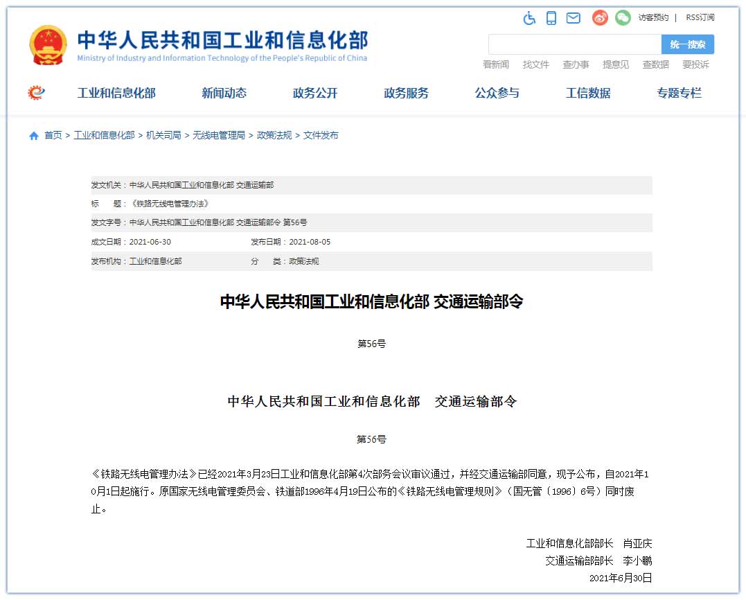 据了解,《铁路无线电管理办法》(以下简称《办法》)已经2021年3月23日工业和信息化部第4次部务会议审议通过,并经交通运输部同意,现予公布,自2021年10月1日起施行。原国家无线电管理委员会、铁道部1996年4月19日公布的《铁路无线电管理规则》(国无管〔1996〕6号)同时废止。