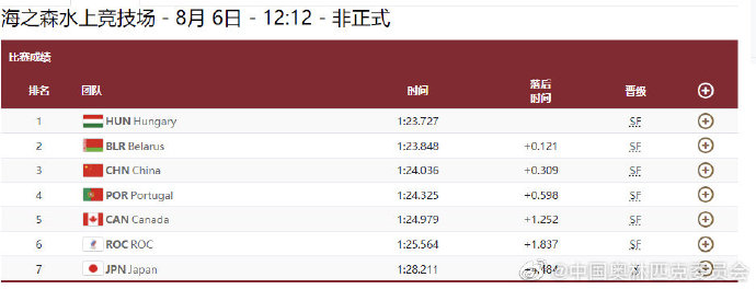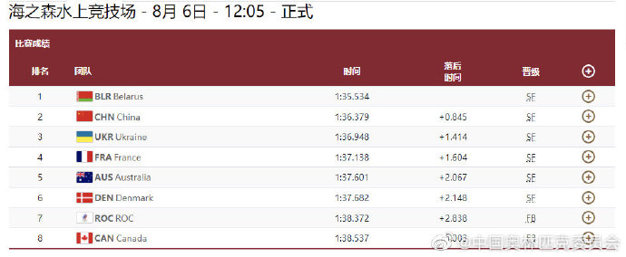 女子500米四人皮艇1/4决赛 中国队所在小组成绩  图片来源:中国奥林匹克委员会微博