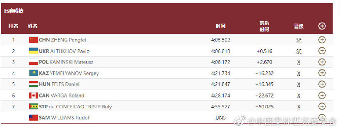 男子1000米单人划艇1/4决赛 中国选手郑鹏飞成绩  图片来源:中国奥林匹克委员会微博