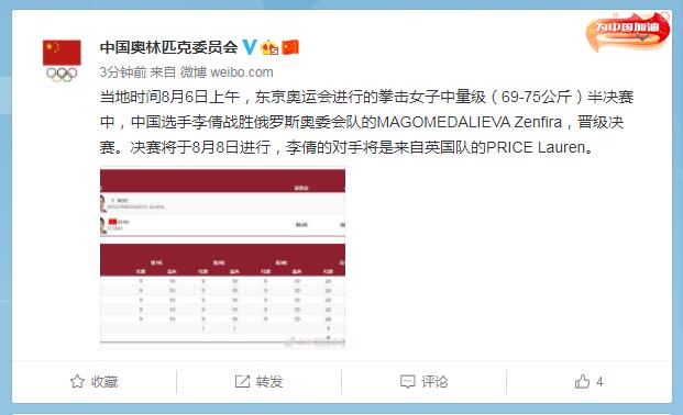 中工网讯 据中国奥林匹克委员会官微消息,当地时间8月6日上午,东京奥运会进行的拳击女子中量级(69-75公斤)半决赛中,中国选手李倩战胜俄罗斯奥委会队的MAGOMEDALIEVA Zenfira,晋级决赛。决赛将于8月8日进行,李倩的对手将是来自英国队的PRICE Lauren。
