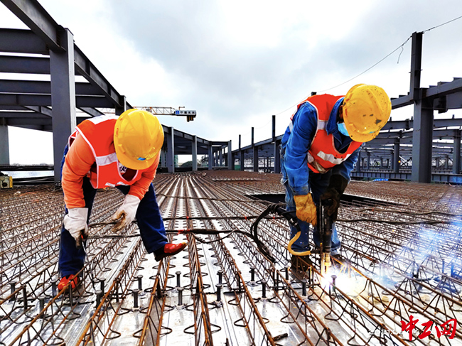 在中建二局华南公司海口美兰临空经济区航空发动机维修基地(平台)一期项目勘察设计施工总承包(EPC)项目的施工现场,工友们头顶烈日,忍受着海南三伏天的闷热,紧张有序地进行着项目2号厂房屋面安装。