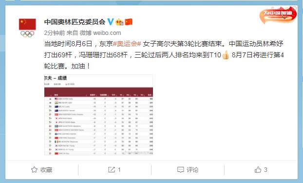 中工网讯 据中国奥林匹克委员会官微消息,当地时间8月6日,东京奥运会女子高尔夫第3轮比赛结束。中国运动员林希妤打出69杆,冯珊珊打出68杆,三轮过后两人排名均来到T10。8月7日将进行第4轮比赛。