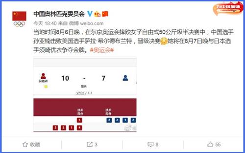 中工网讯 据中国奥林匹克委员会微博消息,当地时间8月6日晚,在东京奥运会摔跤女子自由式50公斤级半决赛中,中国选手孙亚楠击败美国选手萨拉·希尔德布兰特,晋级决赛,她将在8月7日晚与日本选手须崎优衣争夺金牌。
