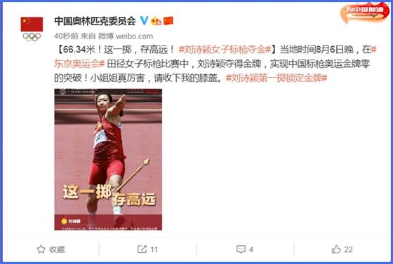 中工网讯 据中国奥林匹克委员会微博消息,当地时间8月6日晚,在东京奥运会田径女子标枪比赛中,刘诗颖夺得金牌,实现中国标枪奥运金牌零的突破!