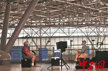 7月30日,记者在媒体中心进行采访,根据防疫要求,记者与受访者拉开了一定距离。