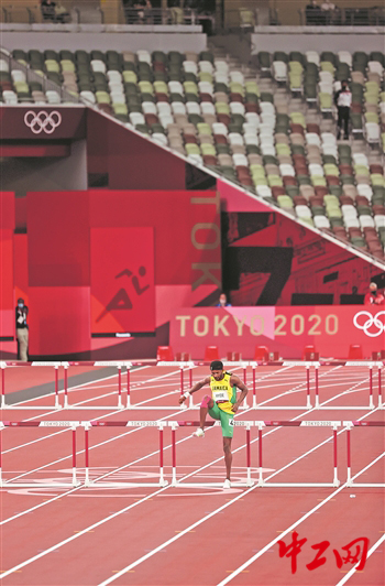 8月1日,在男子110米栏预赛中,一名牙买加选手中途受伤,但他坚持抵达终点,即使是空场比赛。