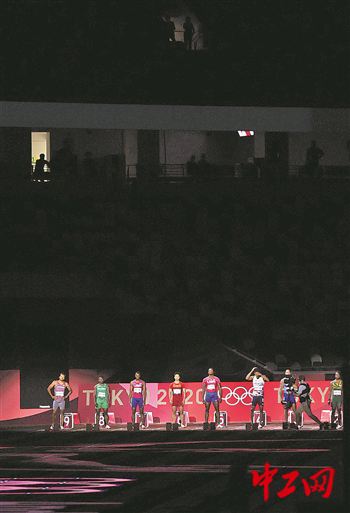 8月1日晚,备受瞩目的男子100米决赛举行。比赛开始前上演灯光秀时,一位工作人员从楼上看台向下观望。