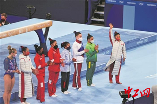 8月3日,在女子体操单项比赛进行前,选手们全部佩戴口罩入场。