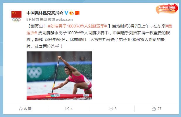 中工网讯 据中国奥林匹克委员会官微消息,当地时间8月7日上午,在东京奥运会皮划艇静水男子1000米单人划艇决赛中,中国选手刘浩获得一枚宝贵的银牌,郑鹏飞获得第8名。此前他们二人曾搭档获得了男子1000米双人划艇的银牌。