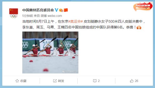 中工网讯 据中国奥林匹克委员会官微消息,当地时间8月7日上午,在东京奥运会皮划艇静水女子500米四人皮艇决赛中,李东崟、周玉、马青、王楠四名中国姑娘组成的中国队获得第6名。