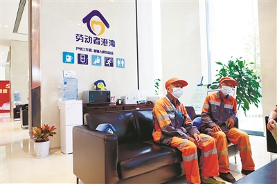 环卫工人在劳动者港湾休息。通讯员郁诗怡 摄