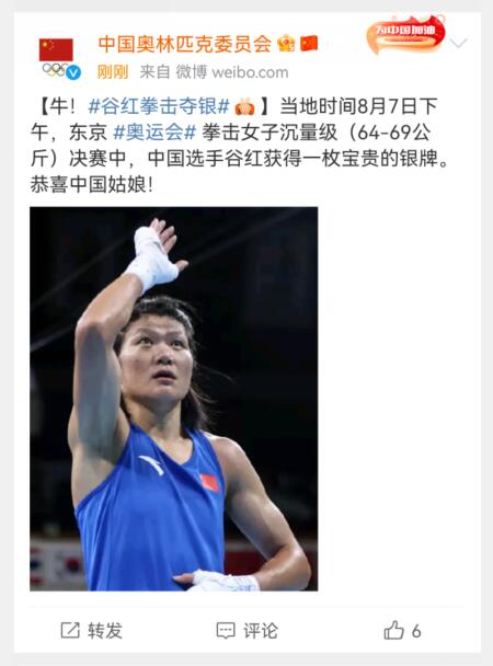 中工网讯 据中国奥林匹克委员会官微消息,当地时间8月7日下午,东京奥运会拳击女子沉量级(64-69公斤)决赛中,中国选手谷红获得一枚宝贵的银牌。