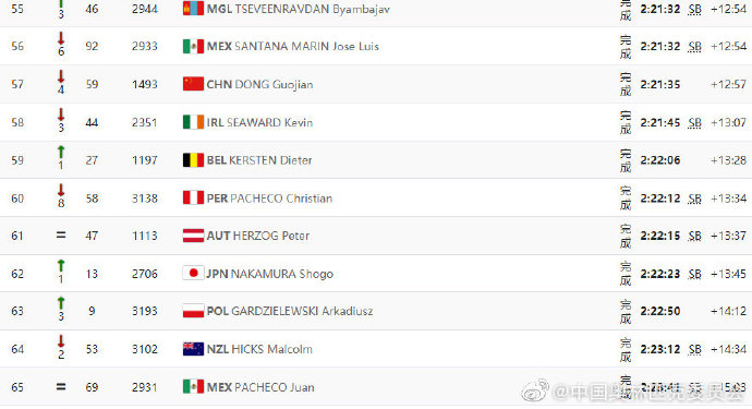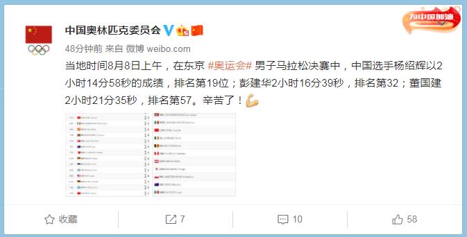 中工网讯 据中国奥林匹克委员会官微消息,当地时间8月8日上午,在东京奥运会男子马拉松决赛中,中国选手杨绍辉以2小时14分58秒的成绩,排名第19位;彭建华2小时16分39秒,排名第32;董国建2小时21分35秒,排名第57。