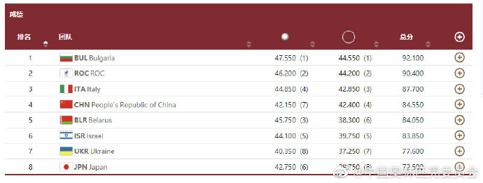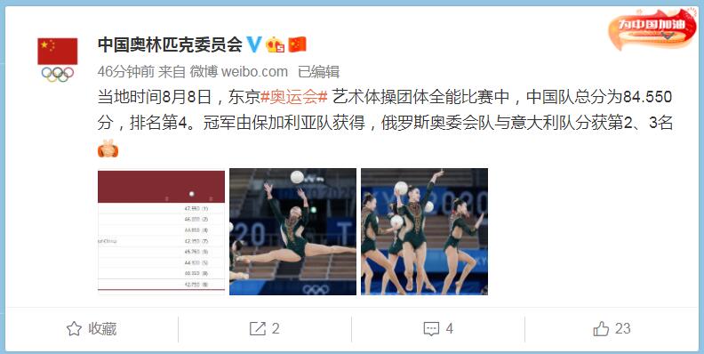 中工网讯 据中国奥委会官网消息,当地时间8月8日,东京奥运会艺术体操团体全能比赛中,中国队总分为84.550分,排名第4。冠军由保加利亚队获得,俄罗斯奥委会队与意大利队分获第2、3名。