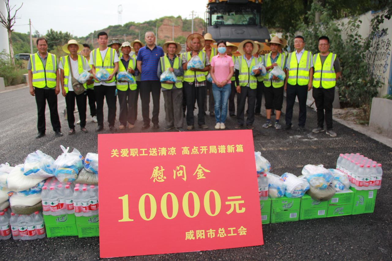 在咸阳市2021年普通干线公路养护大中修工程工地,咸阳公路管理局筑路工人头顶烈日,脚踩高达160摄氏度的新铺沥青路面,个个汗湿衣衫,咸阳市总的工会干部为他们递上消夏“大礼包”和劳保用品。