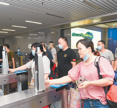 8月4日,浙江省金华火车站出站口启用10条自助健康码闸机验证通道。旅客只需刷二代身份证,就会进行“健康码核验+身份证验证+人脸识别+体温检测”,数秒内便可以快速出站。图为旅客们正通过自助健康码闸机验证通道。李建林摄(人民图片)