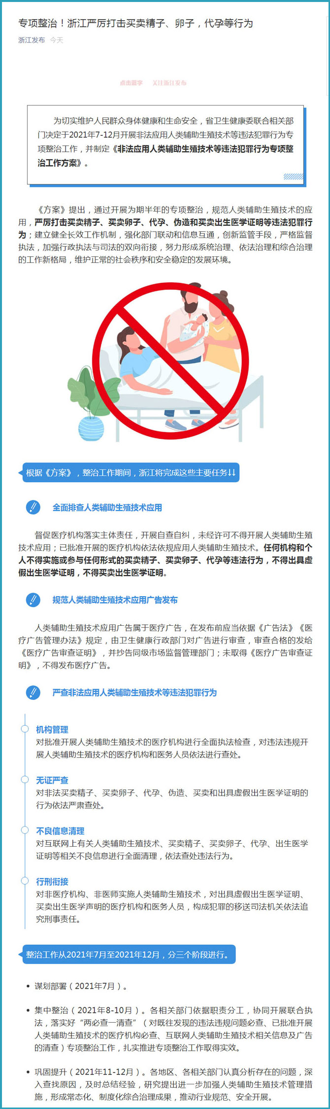 中工网讯 据浙江发布微信公号消息,为切实维护人民群众身体健康和生命安全,浙江省卫生健康委联合相关部门决定于2021年7-12月开展非法应用人类辅助生殖技术等违法犯罪行为专项整治工作,并制定《非法应用人类辅助生殖技术等违法犯罪行为专项整治工作方案》(以下简称《方案》)。