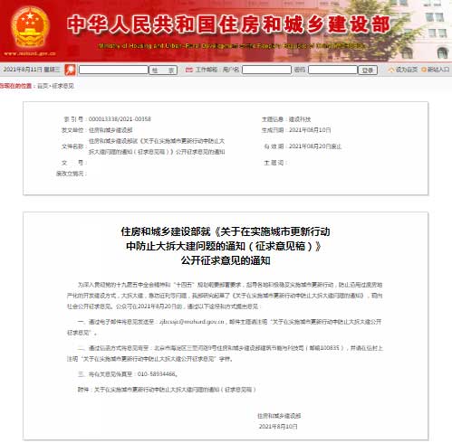 中工网讯 据中华人民共和国住房和城乡建设部网站消息,近日,为深入贯彻党的十九届五中全会精神和“十四五”规划纲要部署要求,指导各地积极稳妥实施城市更新行动,防止沿用过度房地产化的开发建设方式,大拆大建,急功近利等问题,住房和城乡建设部研究起草了《关于在实施城市更新行动中防止大拆大建问题的通知》,现向社会公开征求意见。
