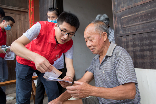 “白翼”志愿者服务队队长边乐超向日本侵华细菌战受害者发放生活医疗常识宣传资料。陈泳伟/摄