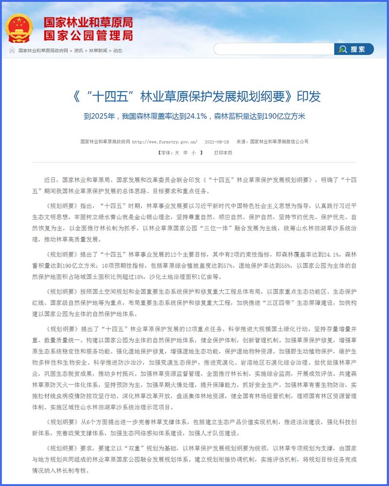 中工网讯 据国家林业和草原局官网消息,8月18日,国家林业和草原局、国家发展和改革委员会联合印发《“十四五”林业草原保护发展规划纲要》(以下简称《规划纲要》),明确了“十四五”期间我国林业草原保护发展的总体思路、目标要求和重点任务。