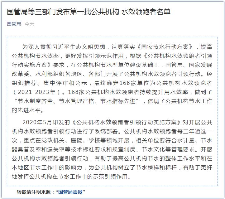 中工网讯 据国家机关事务管理局官方微信公众号消息,近日,国管局、国家发展改革委、水利部组织各地区、各部门开展了公共机构水效领跑者引领行动,经组织推荐、集中评审和公示,最终确定168家单位为公共机构水效领跑者(2021-2023年)。168家公共机构水效领跑者持续提升用水效率,做到了“节水制度齐全、节水管理严格、节水指标先进”,体现了公共机构节水工作的先进水平。