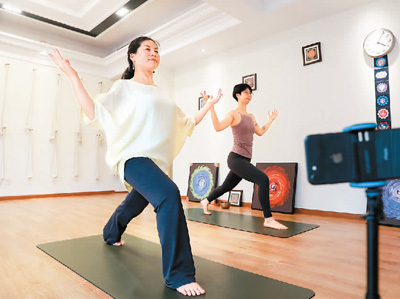 浙江省湖州市德清县武康街道近日邀请瑜伽老师通过手机直播上课,让社区居民们可以在家运动,做到防疫健身两不误。赵 宁摄(人民图片)