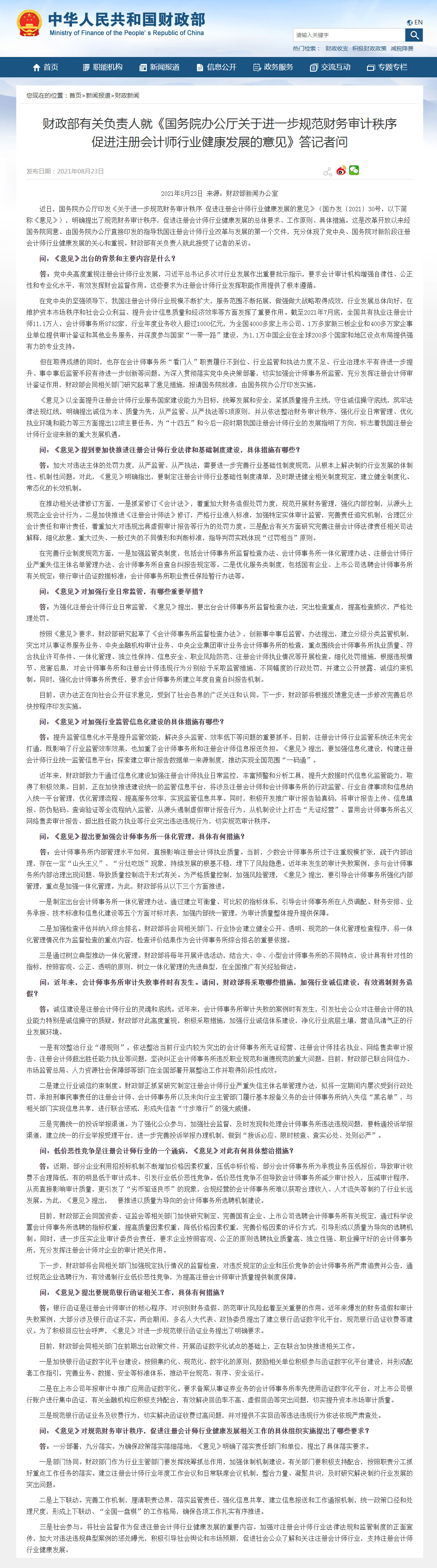 财政部有关负责人就《国务院办公厅关于进一步规范财务审计秩序促进注册会计师行业健康发展的意见》答记者问