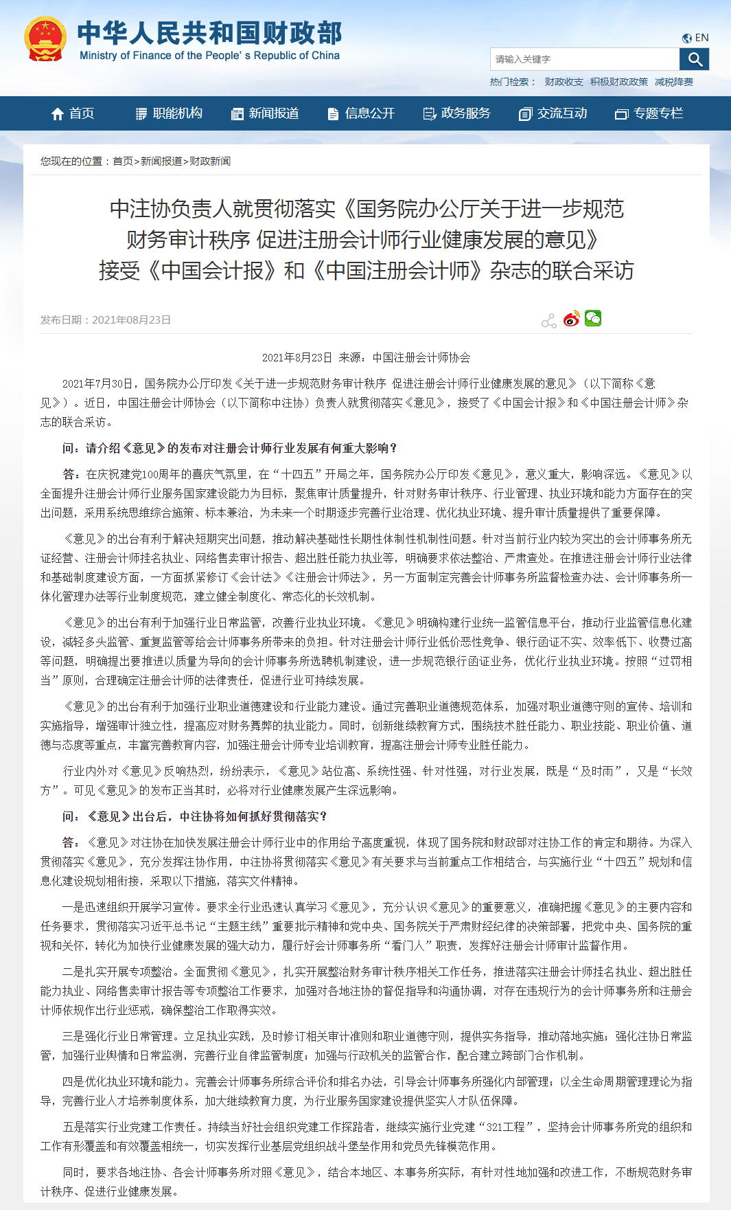 中工网讯 据中华人民共和国财政部网站消息,近日,国务院办公厅印发《关于进一步规范财务审计秩序 促进注册会计师行业健康发展的意见》(国办发〔2021〕30号,以下简称《意见》),8月23日,财政部有关负责人就《意见》答记者问,中国注册会计师协会(以下简称中注协)就贯彻落实《意见》接受采访。