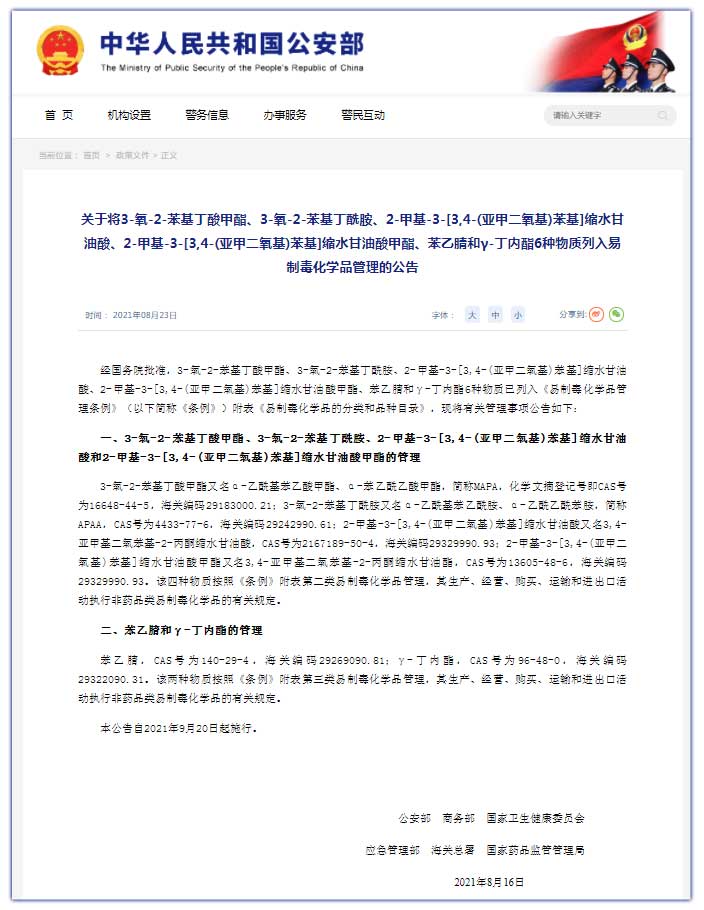 中工网讯 据公安部网站消息,近日,公安部、商务部、国家卫生健康委员会、应急管理部、海关总署、国家药品监管管理局共同发布公告,经国务院批准,3-氧-2-苯基丁酸甲酯、3-氧-2-苯基丁酰胺、2-甲基-3-[3,4-(亚甲二氧基)苯基]缩水甘油酸、2-甲基-3-[3,4-(亚甲二氧基)苯基]缩水甘油酸甲酯、苯乙腈和γ-丁内酯6种物质已列入《易制毒化学品管理条例》(以下简称《条例》)附表《易制毒化学品的分类和品种目录》,现将有关管理事项公告如下: