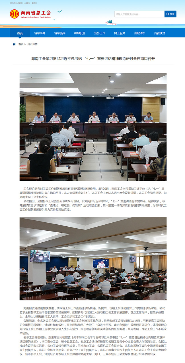 省总工会党组成员、副主席王裕明宣读《关于海南工会学习贯彻习近平总书记“七一”重要讲话精神优秀理论文章评选结果的通报》,海口市总工会、琼中县总工会、省总工会法律保障部和省职工服务中心主要负责人作交流发言。会议以视频会议的形式召开,省总工会领导班子成员,三沙市总工会、省直机关工会联合会、省税务系统工会和中国旅游集团工会主要负责人,省总工会机关各部室、驻会产业工会主要负责人,省总下属事业单位主要负责人在省总工会主会场参加会议。各市县总工会、洋浦经济开发区工会主席和常务副主席,海口、三亚市辖区工会主席在各自分会场参加会议。