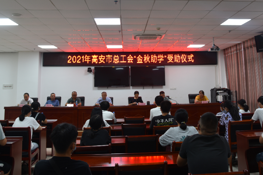 高安市总工会全体班子成员和37名受助大学新生、5名高中生参加受助仪式。