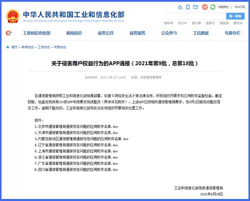 中工网讯 据工业和信息化部官网消息,8月25日,工信部发布了侵害用户权益行为的APP名单以及下架侵害用户权益APP名单的通报。截至目前,检查发现尚有210款APP未按要求完成整改,要求在9月1日前完成整改落实工作。同时,工业和信息化部组织对包括蜻蜓FM等在内的67款APP进行下架。相关应用商店应在本通报发布后,立即组织对名单中应用软件进行下架处理。