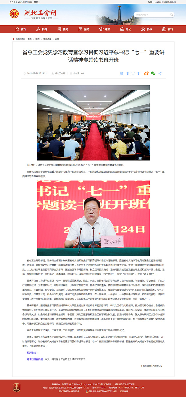 中工网讯 据湖北省总工会网站消息,8月24日,湖北省总工会党史学习教育暨学习贯彻习近平总书记“七一”重要讲话精神专题读书班开班。