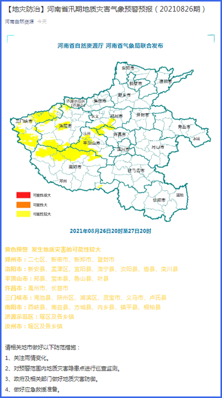 中工网讯 据河南自然资源微信公众号消息, 河南省自然资源厅、河南省气象局日前联合发布汛期地质灾害气象预警预报,08月26日20时至27日20时,河南省地质灾害预警预报达到黄色预警的地区: