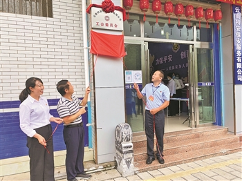 云南省总工会赴基层蹲点工作组第二组组长、省总宣教网络部一级调研员王留德(左二)在为民企云南特安保安服务有限公司建立工会揭牌。