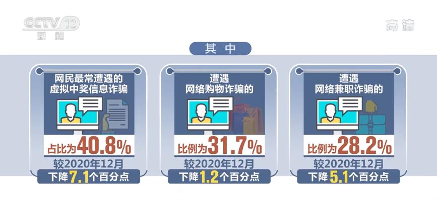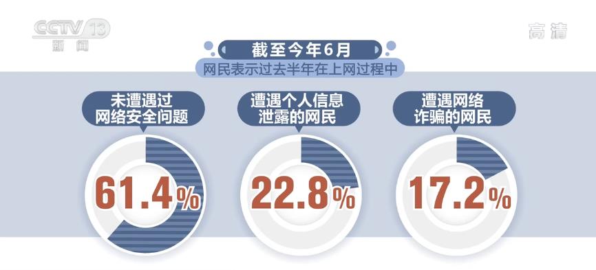 《报告》显示,截至今年6月,61.4%的网民表示过去半年在上网过程中未遭遇过网络安全问题,与2020年12月基本保持一致,遭遇个人信息泄露的网民比例最高为22.8%,遭遇网络诈骗的网民比例为17.2%。