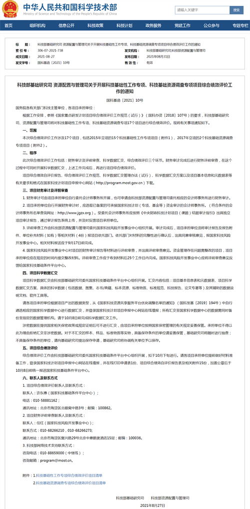中工网讯 据科技部官网消息,8月31日,科技部基础研究司、资源配置与管理司发布关于开展《科技基础性工作专项、科技基础资源调查专项项目综合绩效评价工作》的通知(以下简称“通知”)。