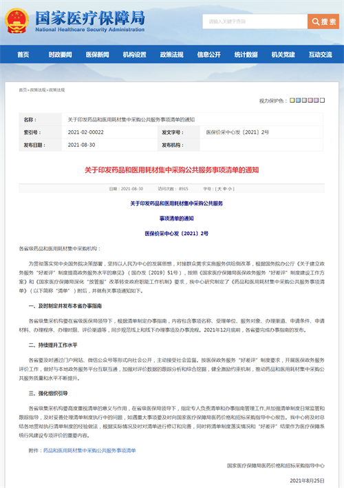 中工网讯 据国家医疗保障局官网消息,近日,国家医保局印发关于《药品和医用耗材集中采购公共服务事项清单》的通知(以下简称“清单”)。