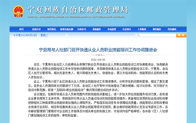 宁夏局与人社部门召开快递从业人员职业技能培训工作协调推进会