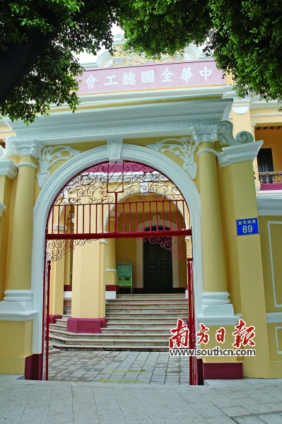 中华全国总工会旧址位于广州市越秀南路,由刘少奇题写的牌匾熠熠生辉。