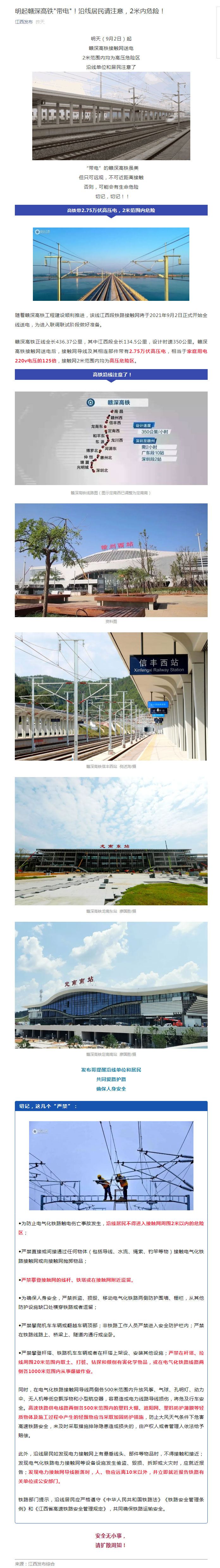 赣深高铁正线全长436.37公里,其中江西段全长134.5公里,设计时速350公里。赣深高铁接触网送电后,接触网导线及其相连部件带有2.75万伏高压电,相当于家庭用电220v电压的125倍,接触网2米范围内均为高压危险区。